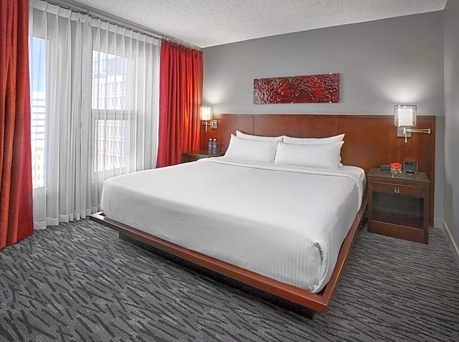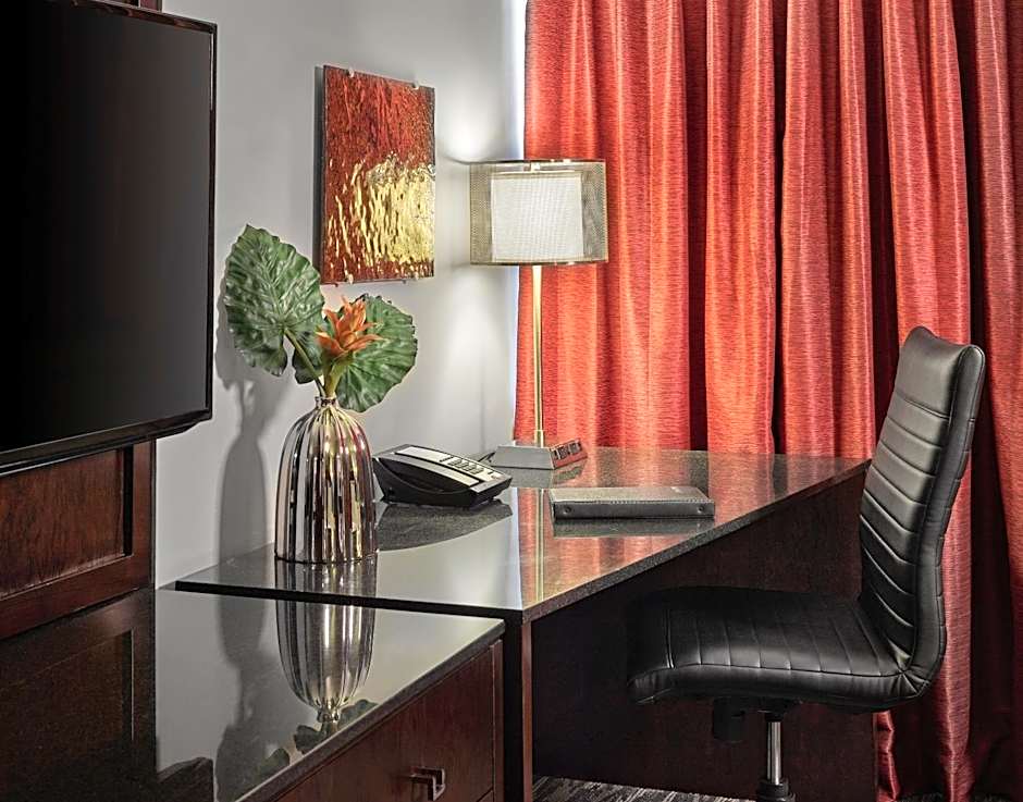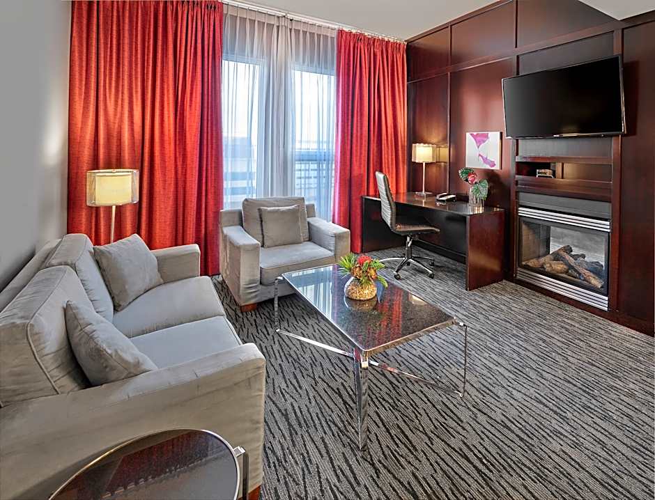 This spacious suite features a fireplace, a living room with a sofa, 2 40-inch flat-screen satellite TVs, city views and a wet bar.